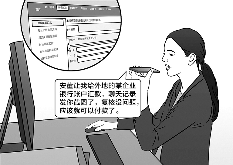 黃某某輕信上述信息,在未向董事長(zhǎng)安某某當(dāng)面或電話核實(shí)、且未見(jiàn)到任何書(shū)面審批手續(xù)的情況下,擅自向外地企業(yè)銀行賬戶發(fā)起、錄入網(wǎng)銀支付,并將聊天群內(nèi)的截圖發(fā)送給該公司會(huì)計(jì)華某某(另案處理),要求其進(jìn)行復(fù)核付款。