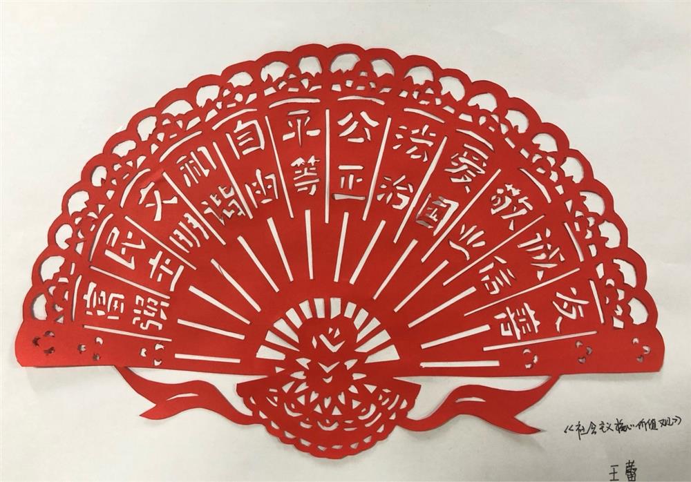園區(qū)投資公司王蕾的作品《社會(huì)主義核心價(jià)值觀》獲得二等獎(jiǎng),作者以緊密有致的扇形設(shè)計(jì)將社會(huì)主義核心價(jià)值觀這個(gè)主題巧妙的呈現(xiàn),作品畫面均衡、線條流暢,美觀大方,有較高的藝術(shù)性和觀賞性。