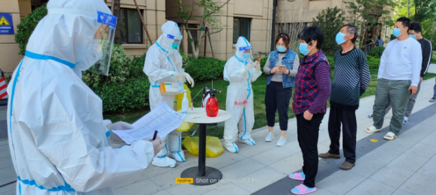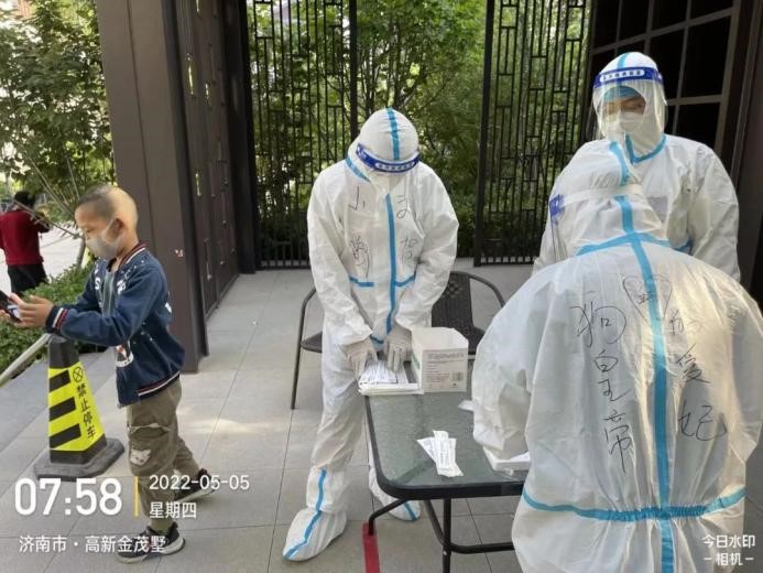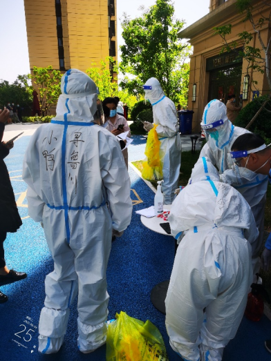 由于一直在高溫下“全副武裝”,志愿者的防護服早已被汗水浸濕,手掌被泡得發(fā)白,臉上也被口罩勒出了痕跡,更有志愿者出現(xiàn)了頭暈、流鼻血等中暑癥狀。盡管如此,他們也是稍加休整,便再次沖鋒向前。休息時間,志愿者們席地而坐,匆匆吃完奔赴崗位,因忙碌而錯過飯點更是常事,然而他們卻從未有過怨言;腰肌勞損、椎間盤不好的團隊干部即使腰疼的直不起來,也依舊抵擋不住他助力抗疫的熱情與行動?!▲喼驹刚邔敶ㄔ趨f(xié)助核酸檢測時,有一個小男孩很不配合,由于當天的核酸檢測并沒有貼紙,男孩媽媽便偷偷準備了小貼畫,拜托尋魯川給小朋友貼上。尋魯川很感動,并且樂意幫忙,尋魯川說:“他兩只大眼睛直勾勾的盯著貼紙看,特別萌,心都被萌化了,真是開心了一整天,所有的疲憊都一掃而空。” …… 在抗“疫”前線,小鴨人和社區(qū)居民們互相理解,互相配合,如此令人感動又暖心的事跡不勝枚舉。