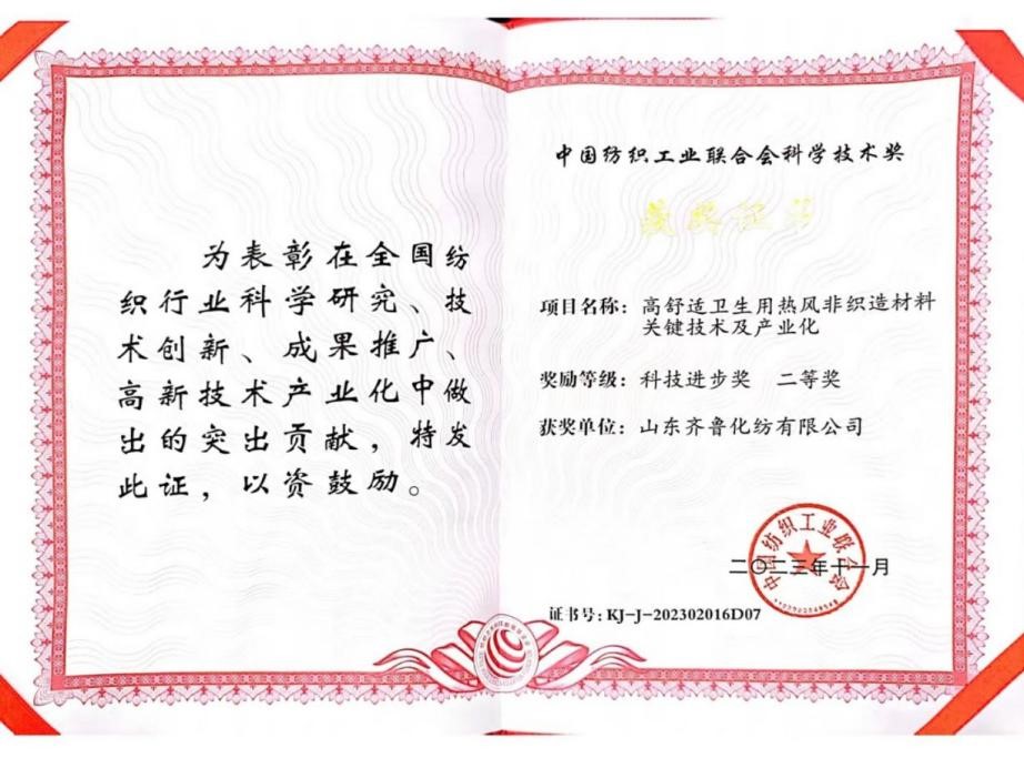 12月6日上午,2023年度中國紡織工業(yè)聯(lián)合會科學(xué)技術(shù)獎勵大會在北京人民大會堂隆重召開。齊魯化纖集團山東齊魯化紡有限公司與天津工業(yè)大學(xué)產(chǎn)學(xué)研團隊共同開發(fā)的“高舒適衛(wèi)生用熱風(fēng)非織造材料關(guān)鍵技術(shù)及產(chǎn)業(yè)化”項目榮獲2023年度中國紡織工業(yè)聯(lián)合會科技進步獎二等獎,化紡公司副總經(jīng)理唐元冰代表公司上臺接受表彰。