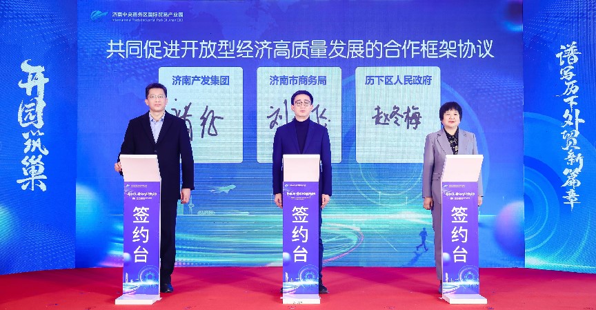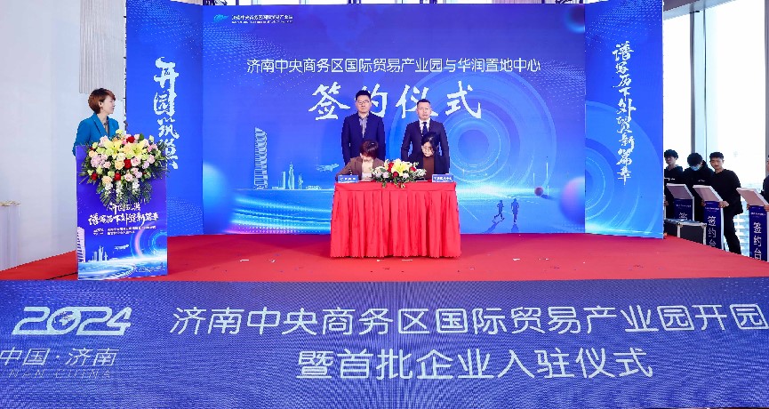 在入駐簽約環(huán)節(jié),濟南國商園區(qū)運營管理有限公司總經理陳蕾與華潤置地中心項目負責人李靜宜簽訂了委托運營協議;劉燕飛、趙冬梅、褚征分別代表濟南市商務局、濟南市歷下區(qū)人民政府、濟南產發(fā)集團共同簽署《共同促進開放型經濟高質量發(fā)展合作框架協議書》;王紅、楊傳軍、趙治文、楊福濤、王海清、黃蓓、邵丹丹共同按下啟動開園按鈕,宣告濟南中央商務區(qū)國際貿易產業(yè)園正式開園。